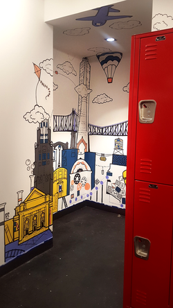 Itaewon Gastropub is located in New York's Koreatown. The mural was in conjunction with a re-branding overhaul of this 2nd story restaurant/bar. The vision is of Itaewon---a renown area in Seoul, Korea known for being a melting pot of its own and often referred to as the "Western Town". Where various people from different cultural backgrounds would gather to share their cuisine.